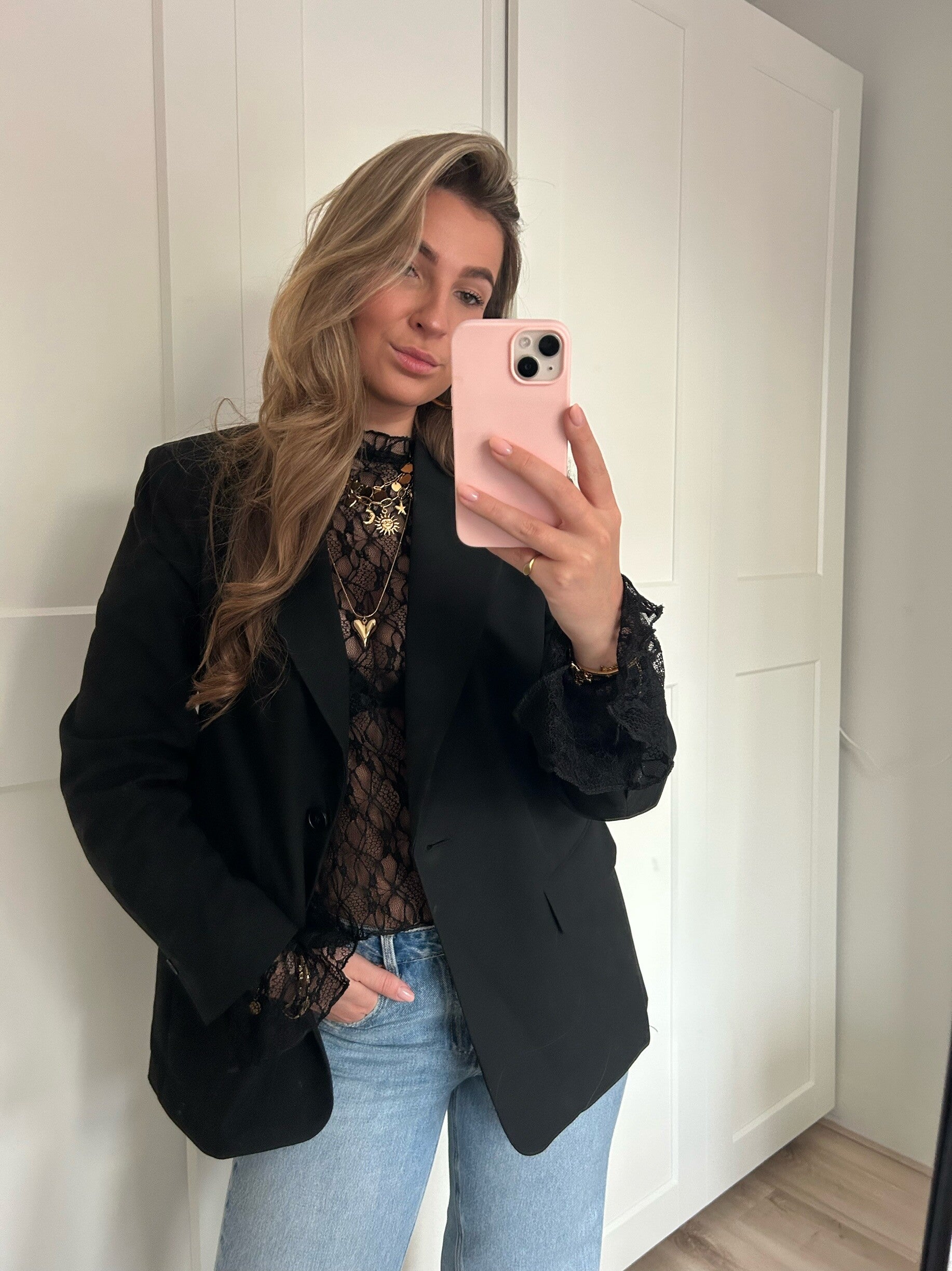 Kanten longsleeve top met wijde mouwtjes. Perfect om onder een trui of blazer te dragen! De top is doorschijnend en erg stretchy.