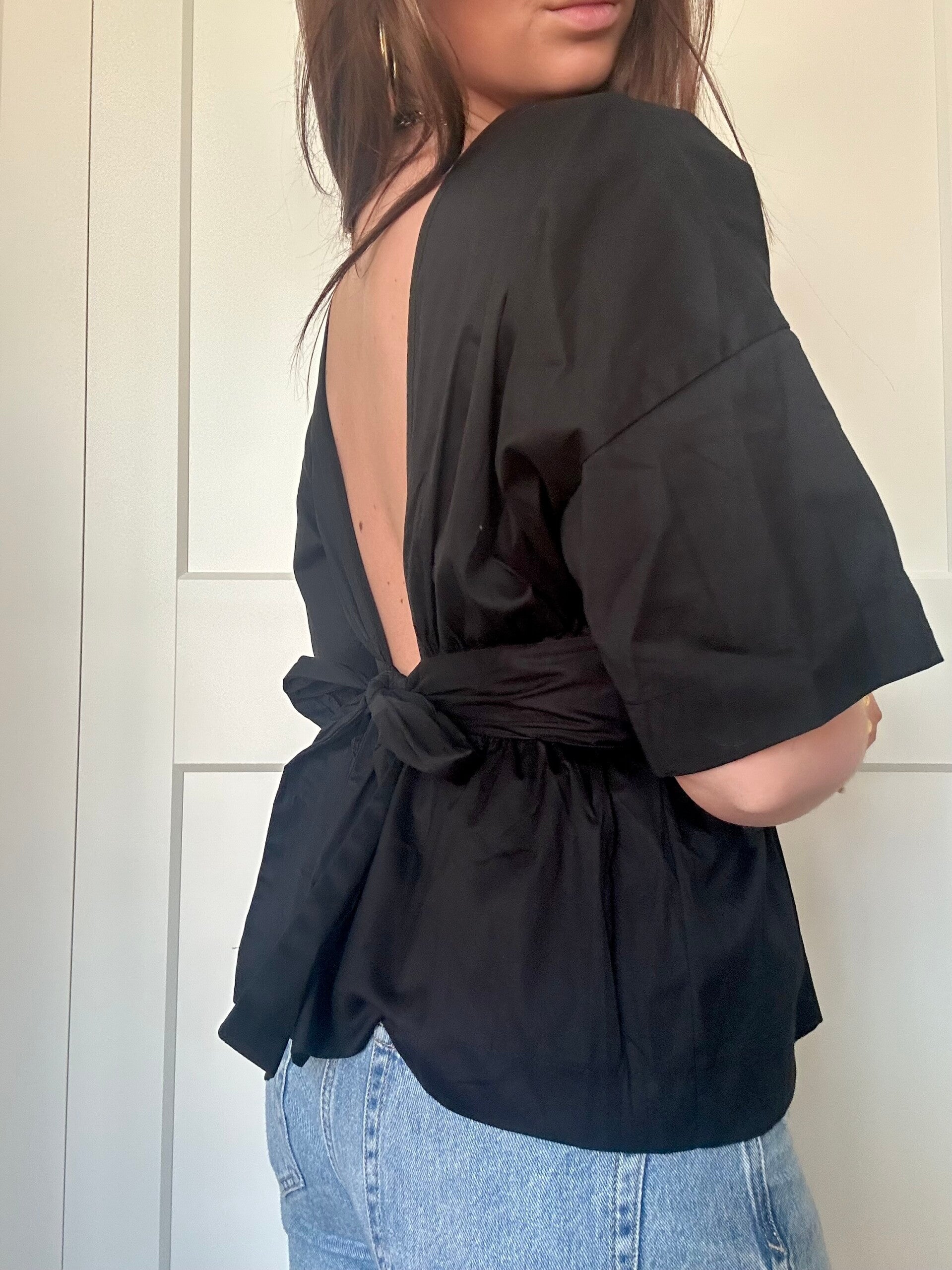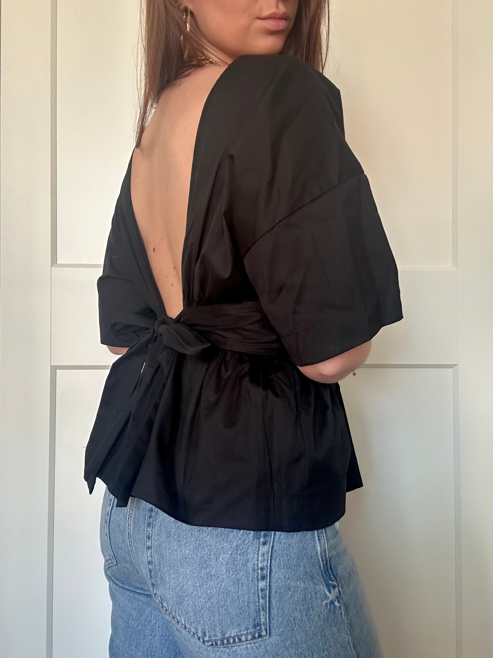 Top met open achterkant en striksluiting waarmee je de top kunt tailleren.