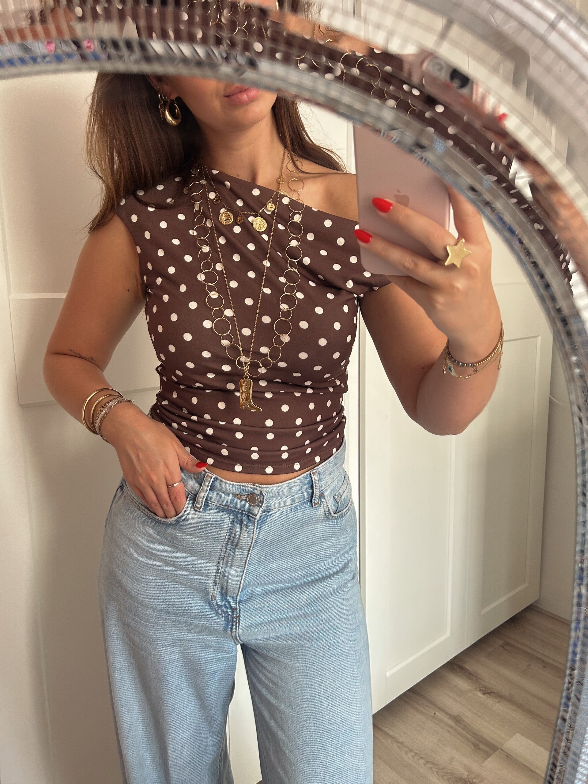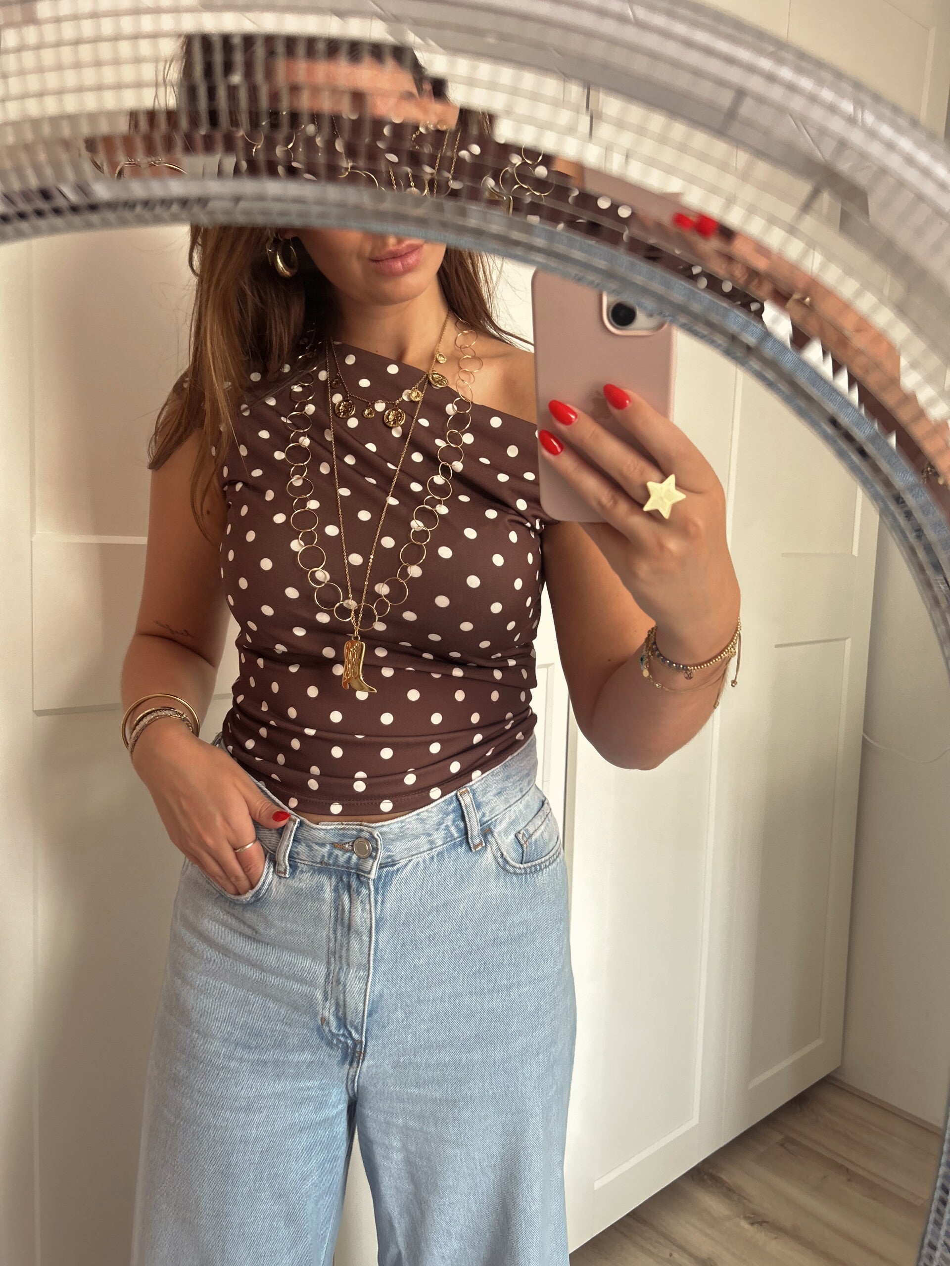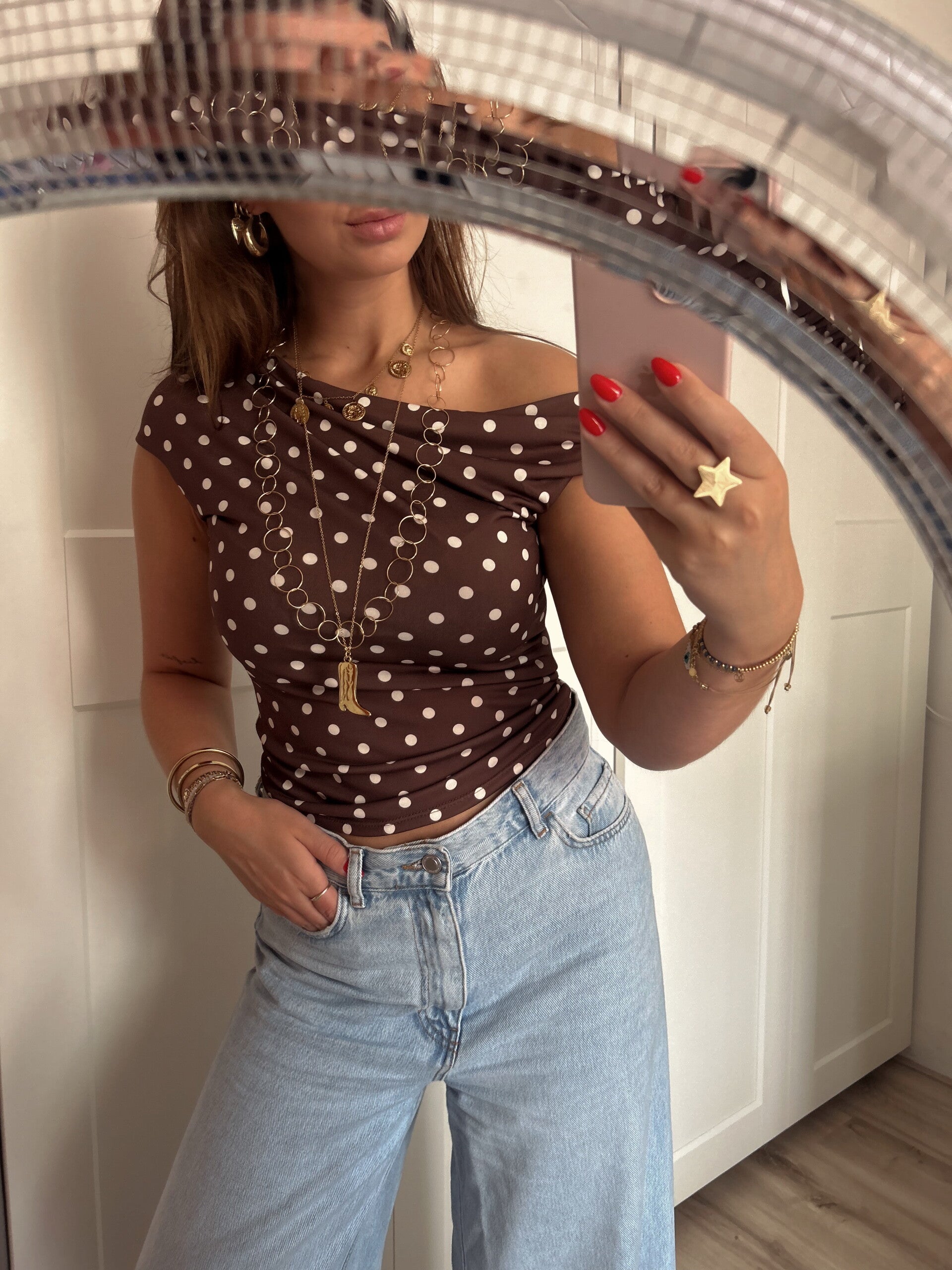 Bruine off-shoulder top met witte stippen. De top heeft een plooidetail aan de zijkant, is gevoerd en schijnt dus niet door!