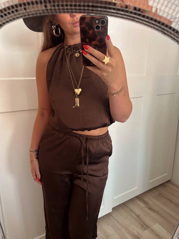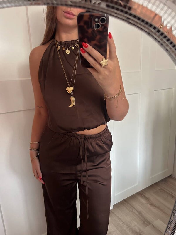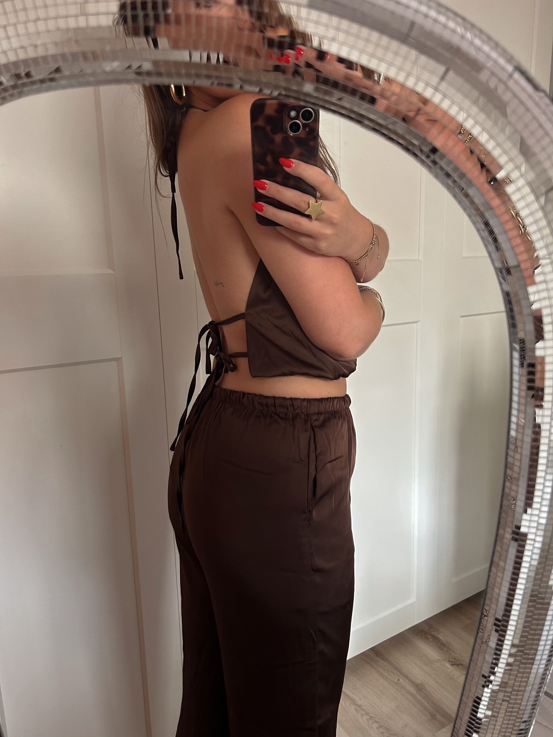 Set in het bruin. De top heeft een halter en open rug aan de achterkant! Kan twee keer gestrikt worden op de rug. De broek bevat elastiek en een rechte pijp. Beide items zijn gevoerd.