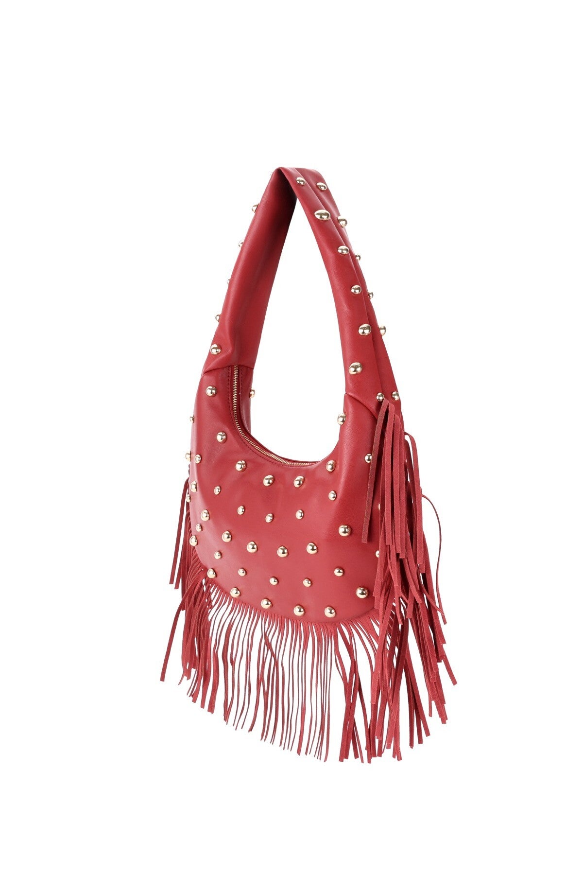 Rode tas met studs en franjes! Gemaakt van PU-leer.