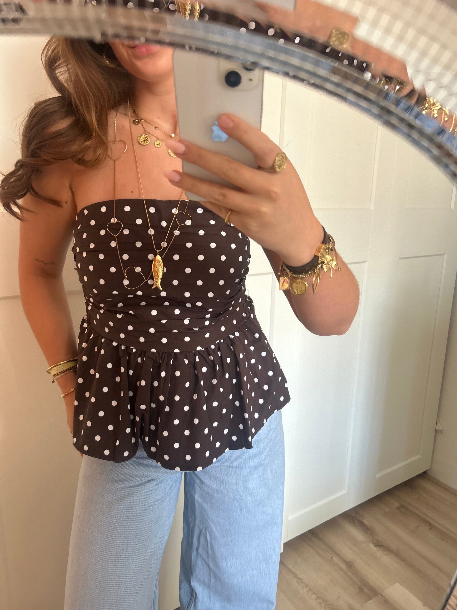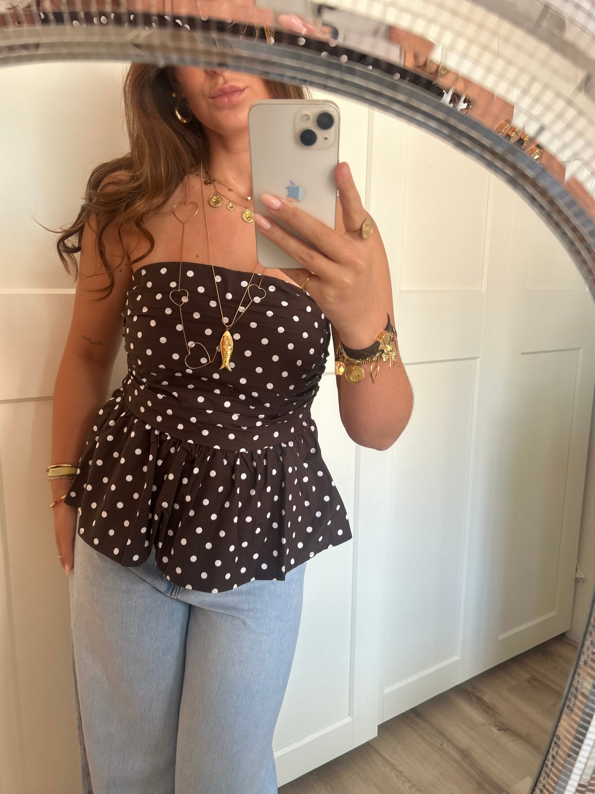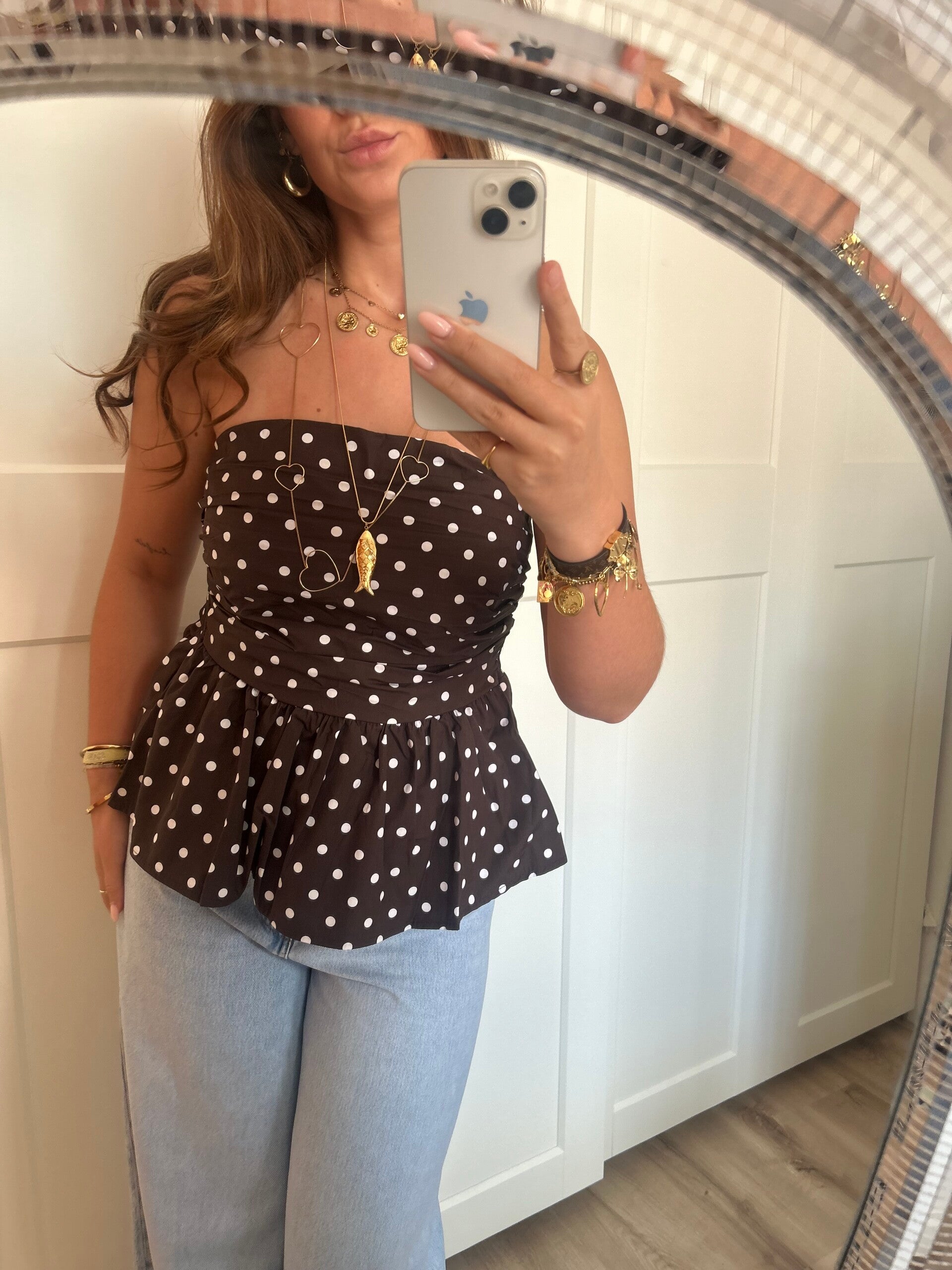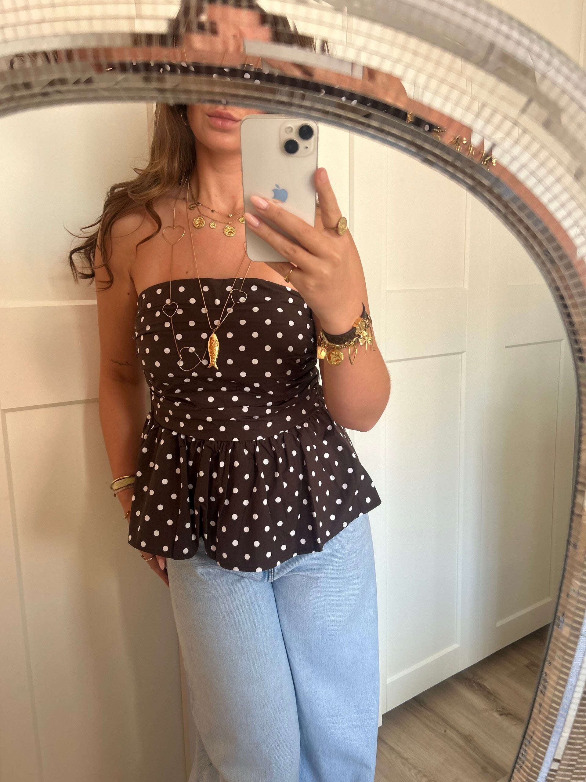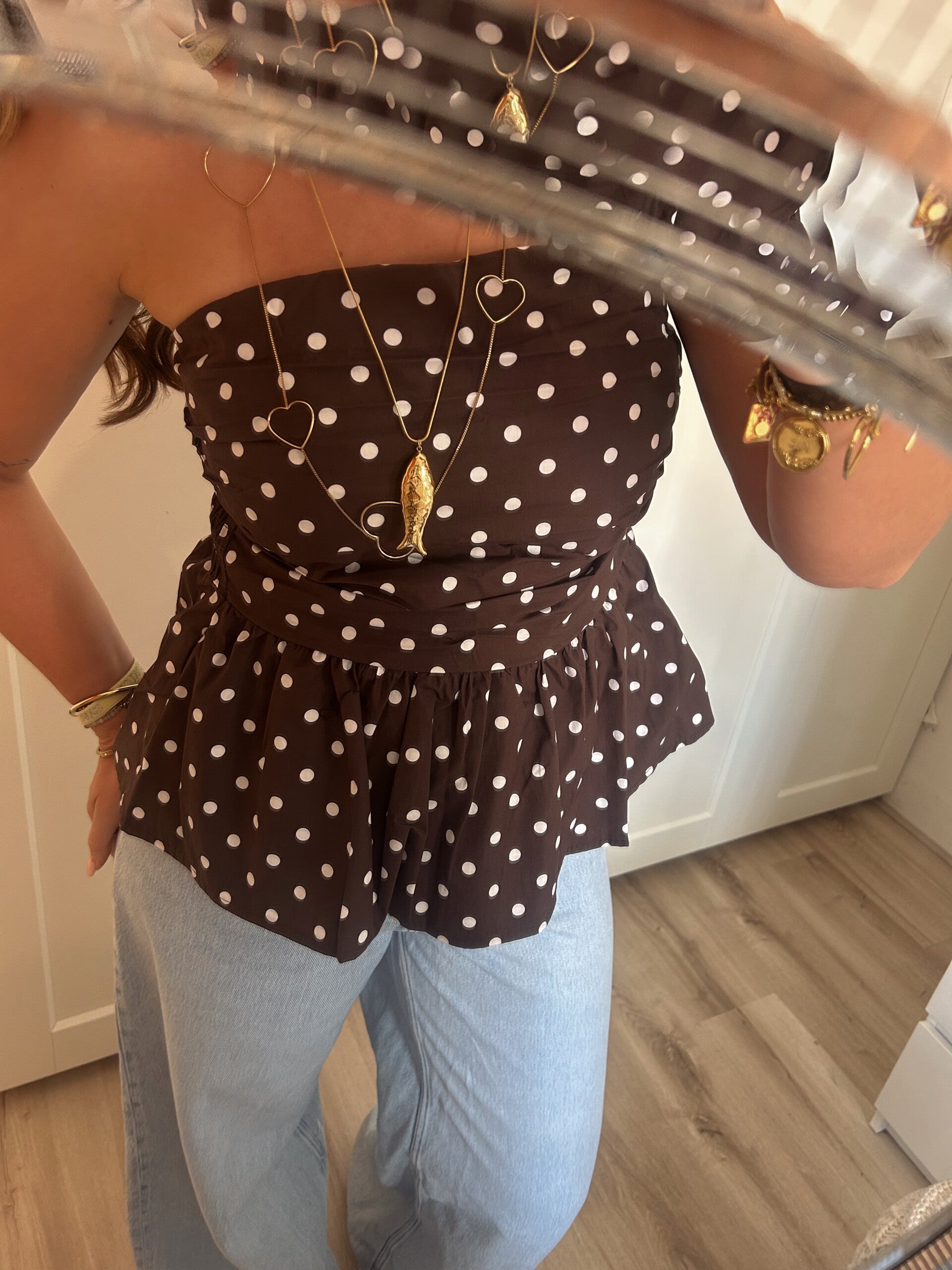 Onze Bandeau Top Dots in het bruin is een mooie bandeau top met een peplum effect. Dankzij de stretch aan de achterkant van de top sluit deze perfect aan!